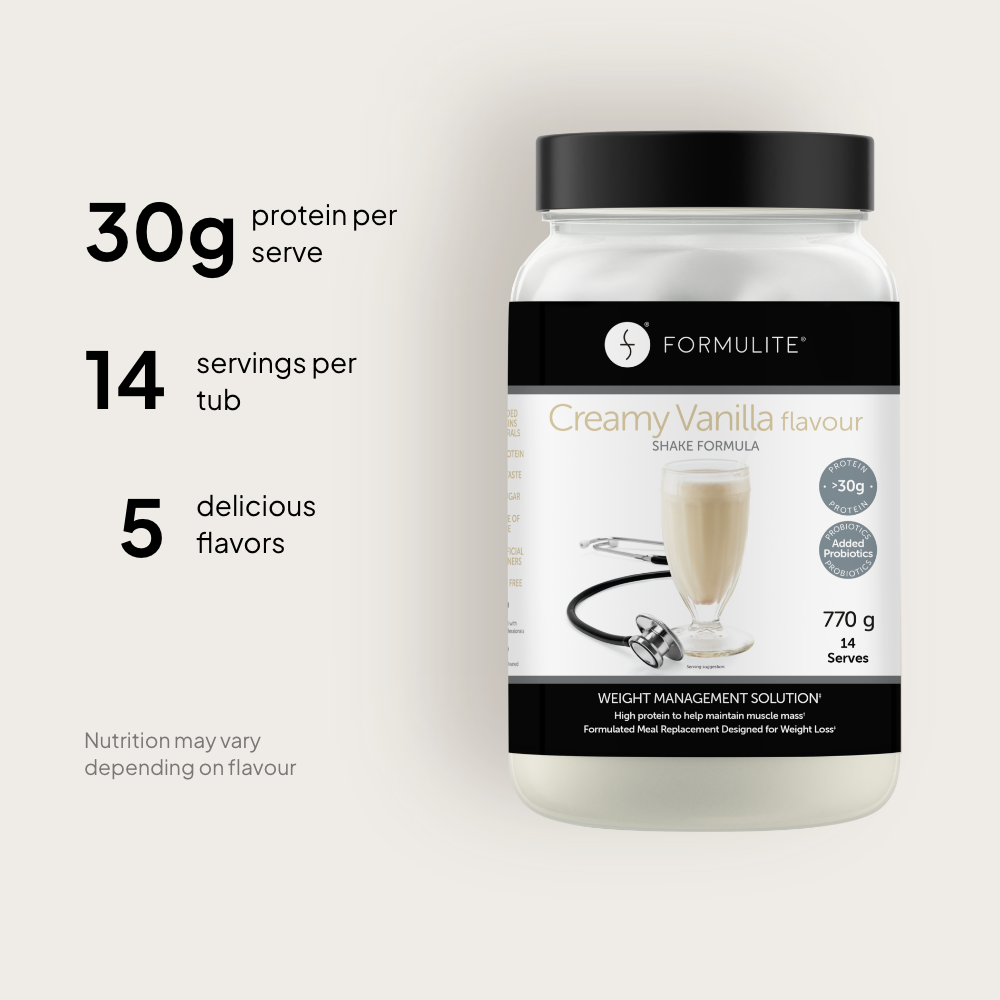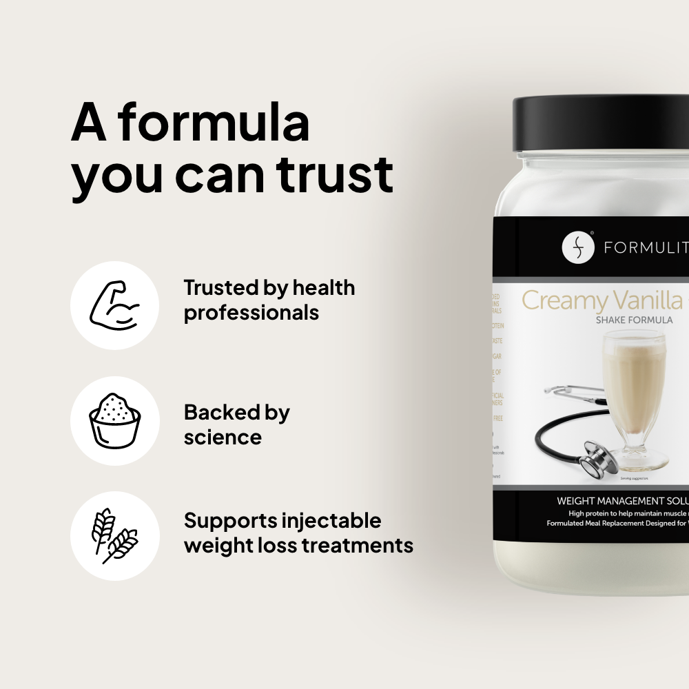 Scientifically-balanced, each shake provides your body with the optimal mix of protein, fibre, fats, and 24 essential vitamins and minerals – delivering maximum nutrition and weight management control. Formulite shakes complement GLP-1 injectable treatments for effective weight loss & nutrition support.
