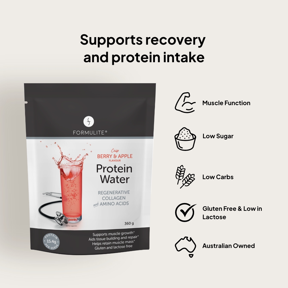 Formulite recovery collagen protein water provides an excellent protein source that is also low-carb, low-sugar, gluten and lactose-free.