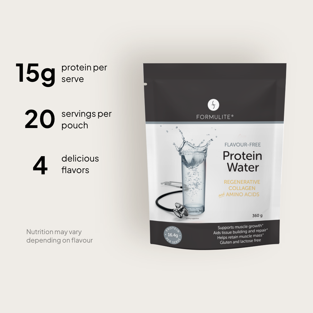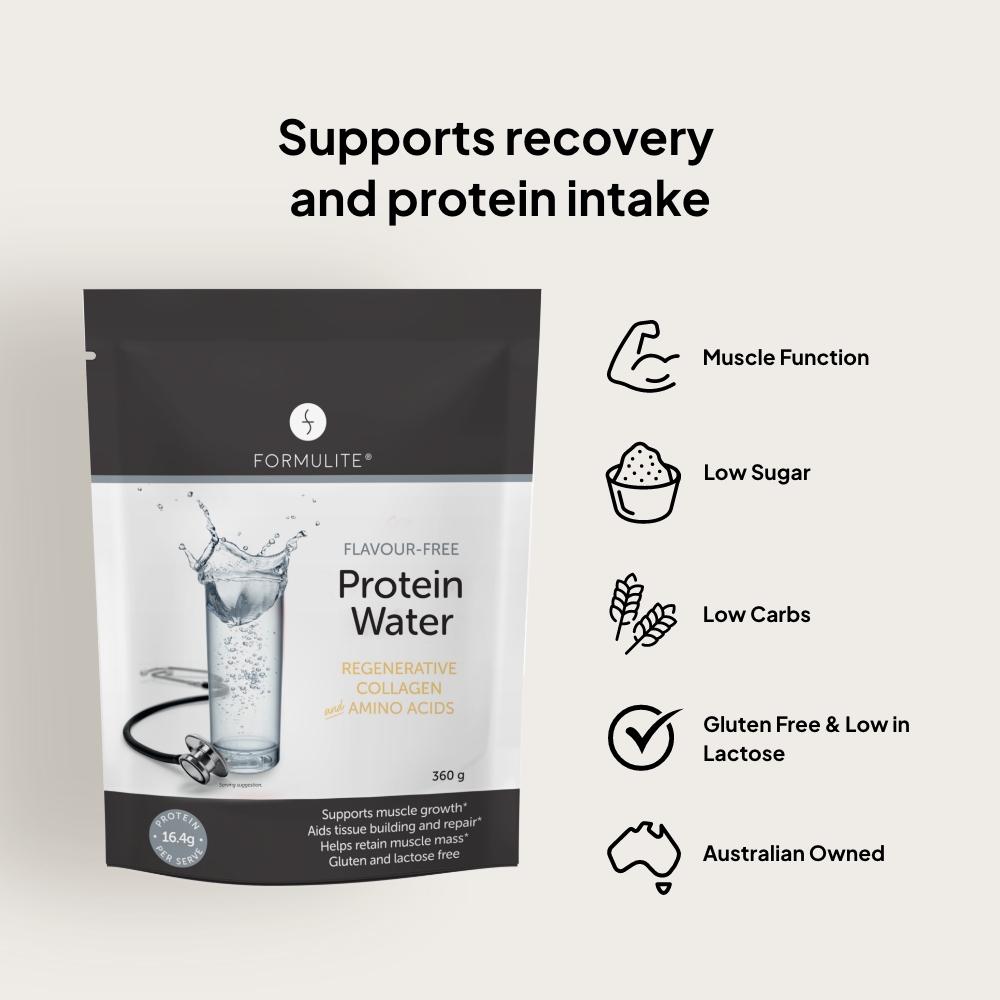 Formulite recovery collagen protein water provides an excellent, low-carb, low-sugar, gluten and lactose-free protein source.