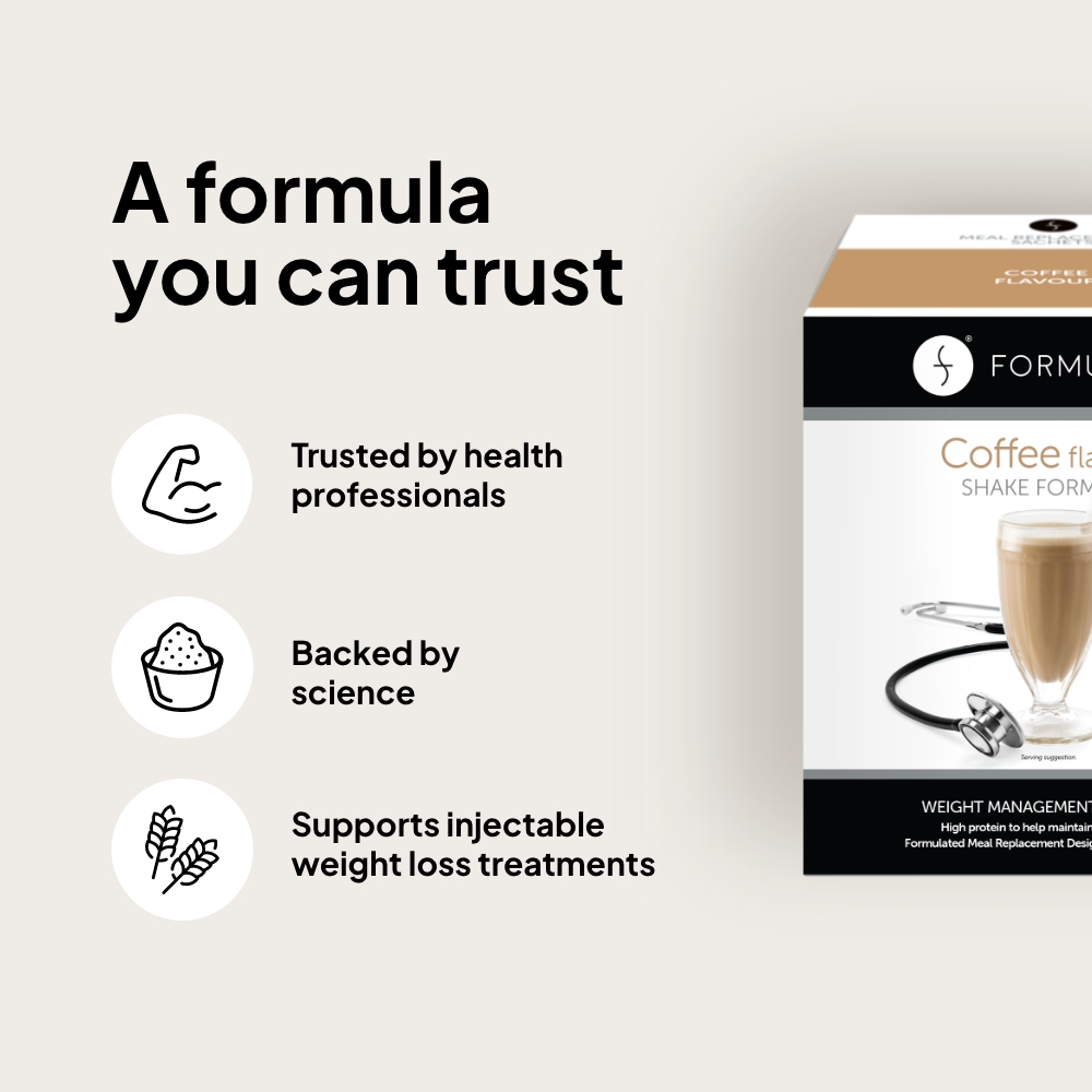 A good source of fibre and scientifically-balanced, each shake also provides your body with the optimal mix of protein, fats, and 24 essential vitamins and minerals – all delivering maximum nutrition and weight management control. Formulite shakes complement GLP-1 injectable treatments for effective weight loss & nutrition support.